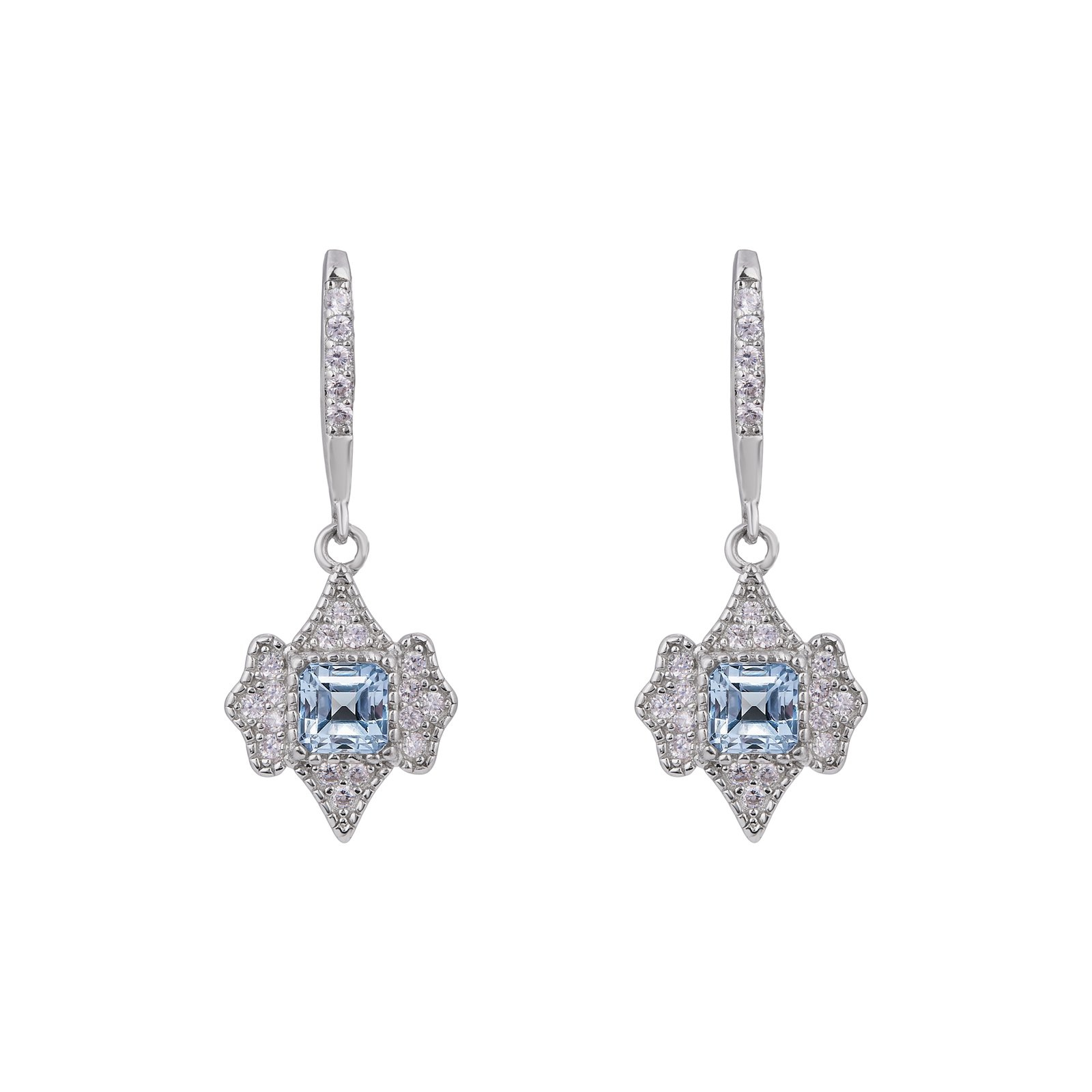 Earrings in 14K White Gold Plated 925 Sterling Silver with Natural Aquamarine and CZ Zircon.