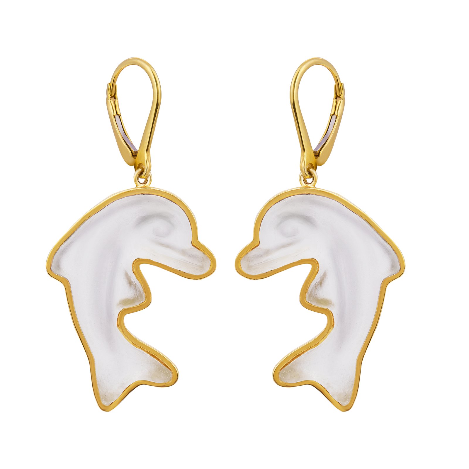 Handmade earrings in 14K Yellow Gold Plated 925 Sterling Silver with Hand Carved Dolphins in Natural Clear Quartz.