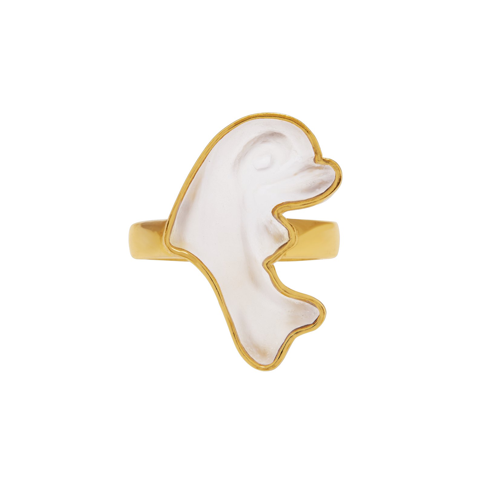 Handmade ring in 14K Yellow Gold Plated 925 Sterling Silver with Hand Carved Dolphin in Natural Clear Quartz.