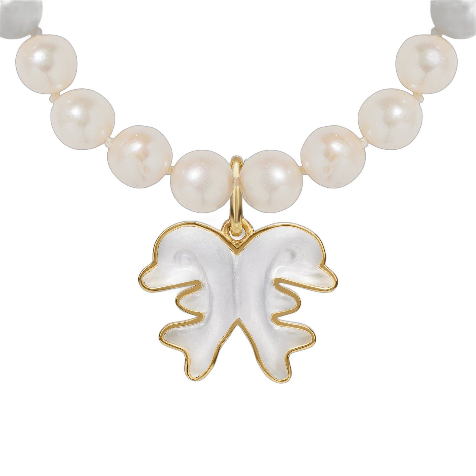 Handmade Pendant in 14K Yellow Gold Plated 925 Sterling Silver with Hand Carved Dolphins in Natural Clear Quartz and Necklace with Natural fresh water Pearls and 14K Gold Plated 925 Sterling Silver Clasp.