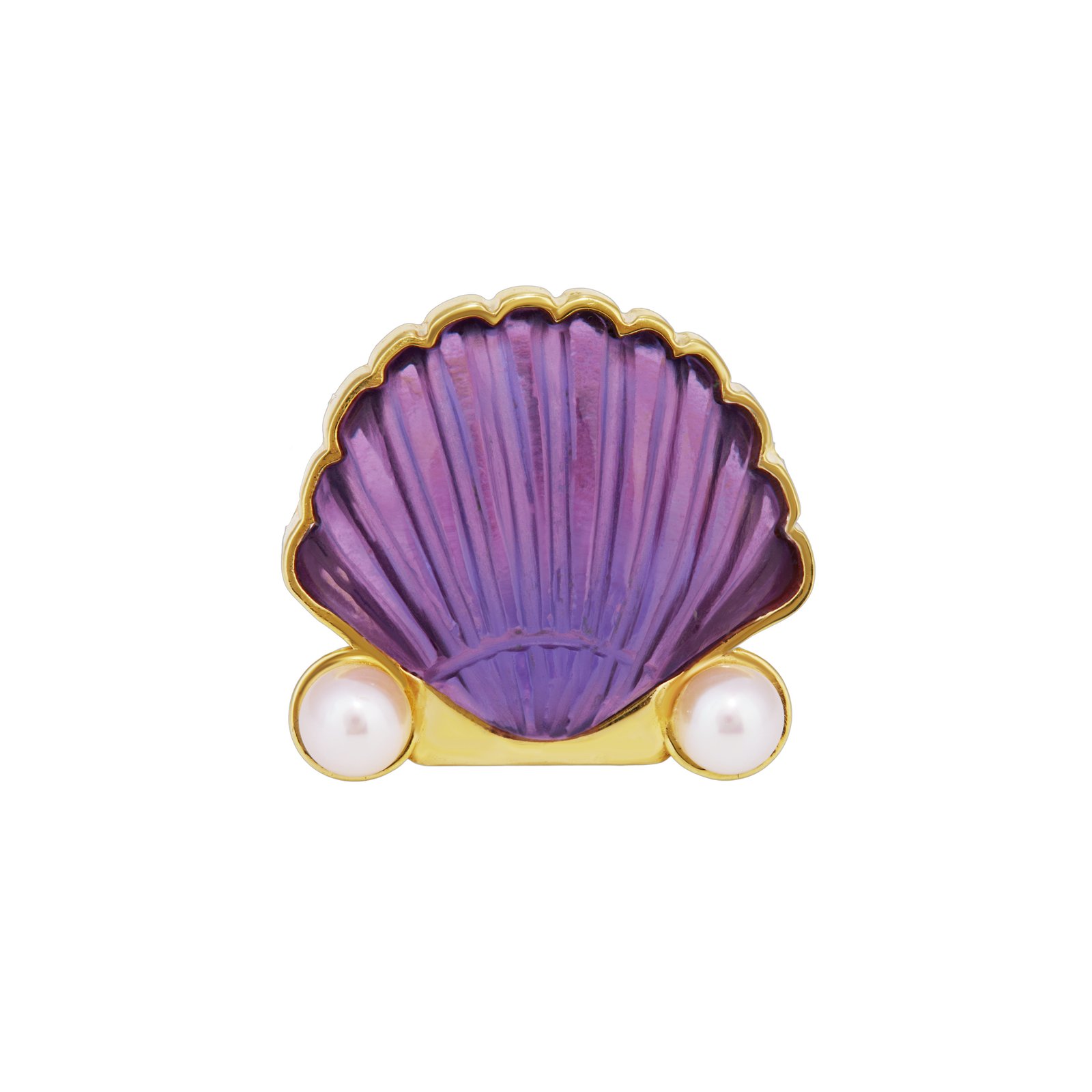 Handmade ring in 14K Yellow Gold Plated 925 Sterling Silver with Hand Carved Shell in Natural Amethyst and Fresh Water Pearls.